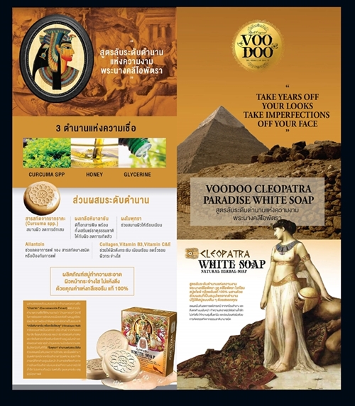 Voodoo Cleopatra White Sope สุดยอดส่วนผสมชั้นเลิศจากตำนานชาวอียิปต์โบราณ เคล็ดลับความงามของพระนางคลีโอพัตรา ตำนานสางวสองพันปีของแท้!!! รังสรรมาเป็นสบู่ที่ขายดีที่สุด ณ. ขณะนี้ กลีเชอร์ลีนแท้ 100 % และส่วนผสมจากสมุนไพร แก้แพ้ หน้าขาว ไร้สิว ไร้ผิวมัน สูตรลับนี้ ในตำนานนี้ ที่คุณไม่ควรพลาด!! ต้องลอง!! ปฏิวัติสบู่แบบเดิมๆ ด้วยสรรพคุณลดผดผื่นคัน ลดการแพ้สารเคมีจากเครื่องสำอางค์ และสิ่งตกค้างบนใบหน้า ทำความสะอาดผิวได้อย่างล้ำลึก ไม่แห้งตึง ให้ความชุ่มชื่นแก่ผิว ลดอาการอักเสบของผิวหน้า อ่อนโยนต่อผิวด้วยการคัดสรรสารสกัดจากธรรมชาตินานาชนิด ช่วยให้ผิวกระจ่างใส ไร้สิว ขจัดสิ่งอุดตันอย่างล้ำลึก ช่วยดีท็อกซ์ผิวหน้า พร้อมทั้งเพิ่มแร่ธาตุที่จำเป็นให้แกผิวคุณ ผิวของคุณจะสะอาดใสไ้สิว และสิ่งสกปรกติดค้างบนผิวหน้า